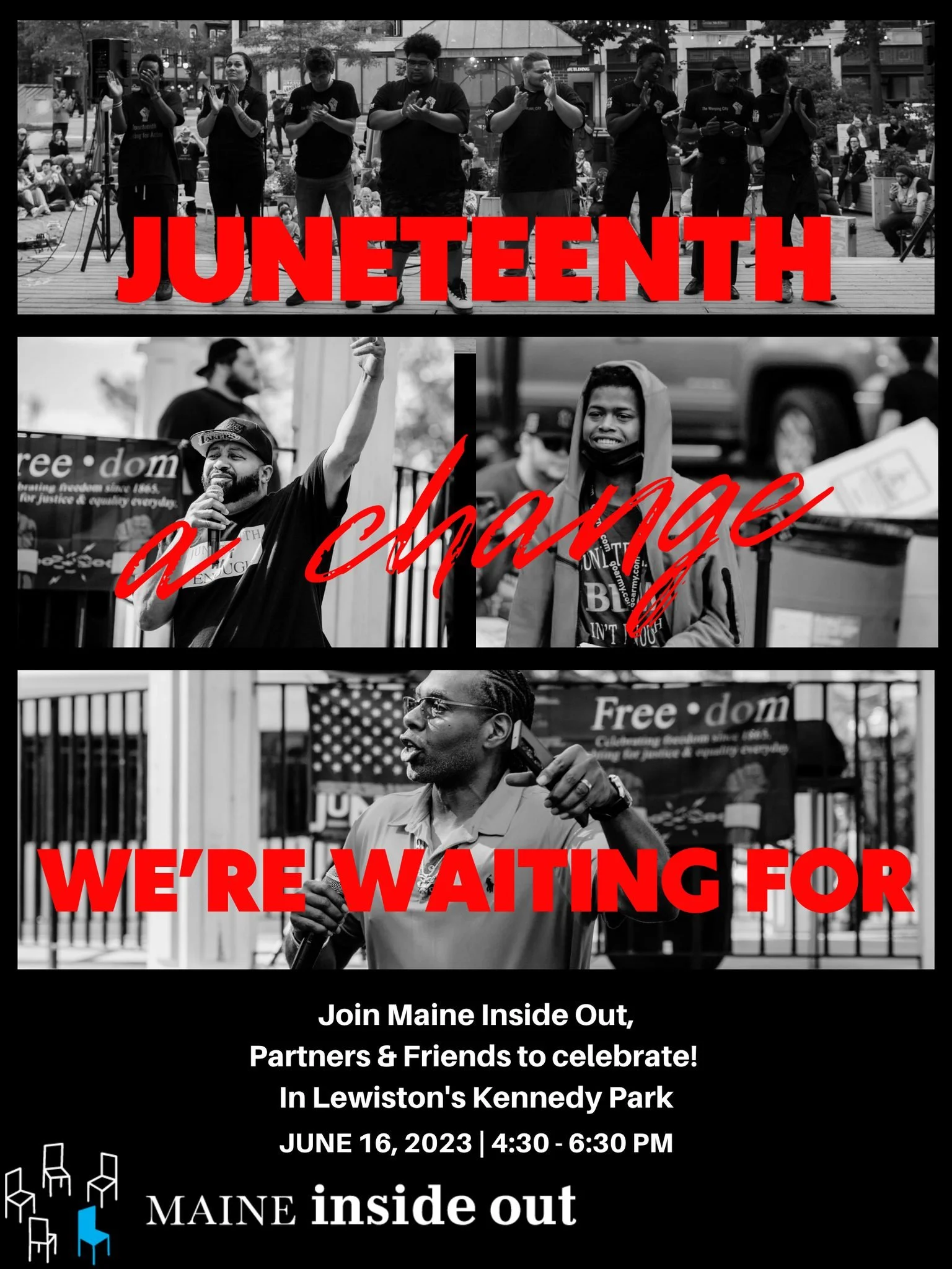On Friday June 16, 2023 from 4:30-6:30pm in Lewiston's Kennedy Park, Maine Inside Out and partners will host a public celebration of Juneteenth. The event honors the emancipation of enslaved people in America while recognizing that the systems and structures of chattel slavery are still intact today.